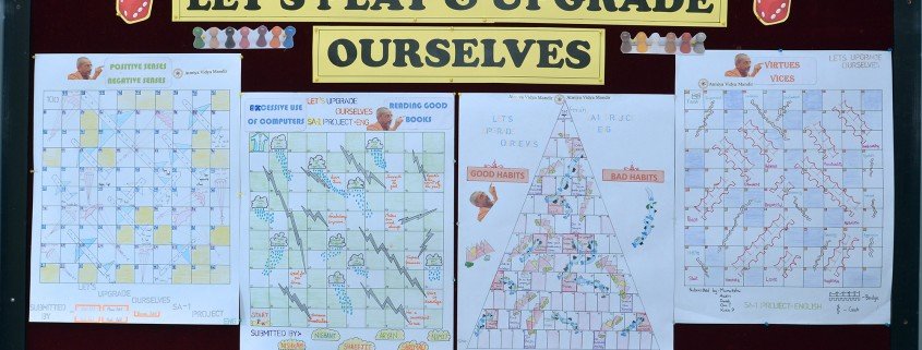 Here at Atmiya Vidya Mandir, we get to do many unique projects. One such project is ‘Let’s upgrade ourselves’, made by students of grade 6. In that, students had to create a theme-based Snakes & Ladders game. It was a language project through which students also got an opportunity to use their creativity, presentation skills and teamwork.
