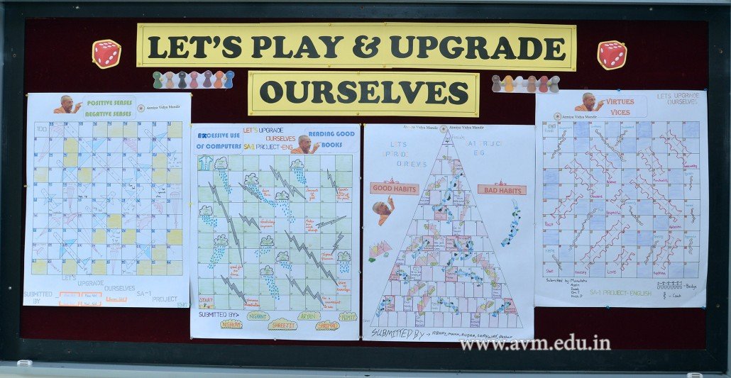 Here at Atmiya Vidya Mandir, we get to do many unique projects. One such project is ‘Let’s upgrade ourselves’, made by students of grade 6. In that, students had to create a theme-based Snakes & Ladders game. It was a language project through which students also got an opportunity to use their creativity, presentation skills and teamwork.