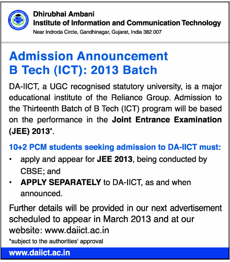 Admission Announcements for DA-IICT, VIT, Manipal and Veterinary Courses