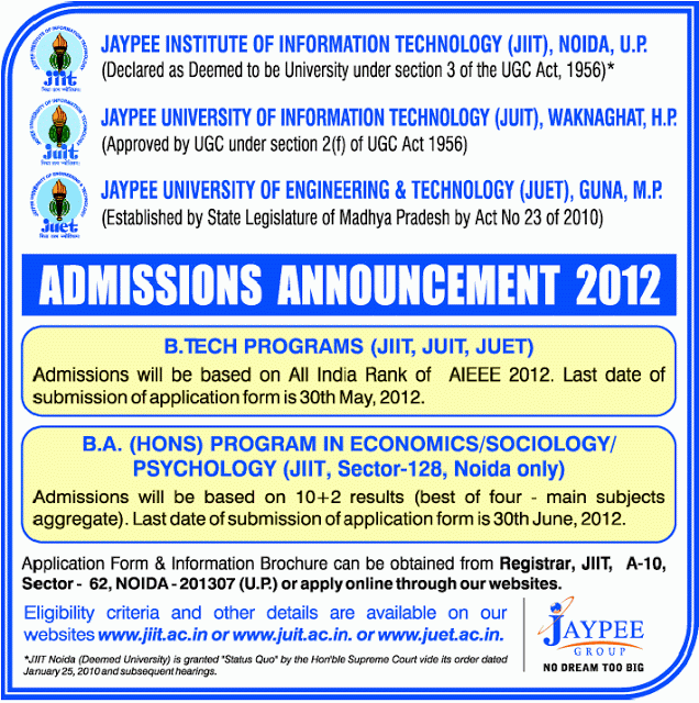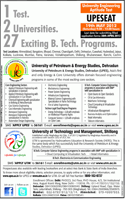 Please see below for their announcement of the UPES Engineering Aptitude Test (UPESEAT) for admissions for 2012-13: