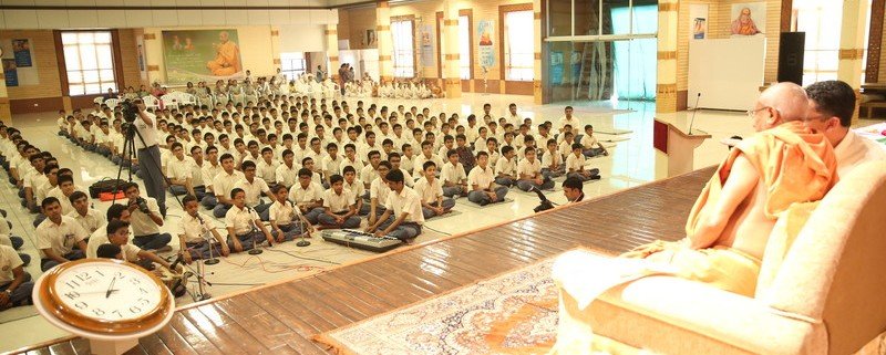 /0 Comments/in AVM Updates, Motivational, Value Based Education /by Seema JoshiHis boundless love for the students called for an assembly (Sabha) which was held in the school prayer hall on 25th February 2014. The hall was brimmed with devoted heads and eager hearts as Swamishree addressed all with His kind and deep concern. To begin with, the students sang a heart stirring lyrical hymn… adding a bit edge to the ardent ambiance and there came a benign smile on Swamishree’s face as He listened to these prayers being offered to Him. Purvesh Sir handled the mic and being a zestful host of the programme, he shared a few incidences where students of AVM evidently practised ideal behaviour in classes, playground and in hostel. Soon after Vinamrabhai of Std 8th was invited on the stage to present a brief report on cultural activities through which lessons of harmony and the moral values are imparted to the students. Thereafter, Purvesh Sir specified a few more incidents stating how the very mission of the school “Union of Body, Mind and Soul” is being accomplished. This brought an appreciating and enchanting gesture on Swamishree’s face and His encompassing gaze left us in total bliss. After that Abhishekbhai Ariwala and Nileshbhai Yadav of Std 12th offered a prayer on behalf of all students and asked for His blessings in all their endeavours. It was followed by a much awaited and momentous opportunity for the students of class 12th to get one-to–one meeting with Swamishree. He was being affectionate, listening patiently to each one of them enveloping them in His divine aura and blessing them.
