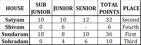 The overall house winner position was a bit tricky as no particular house team dominated all the three categories. Following is the overall points table for the competition: